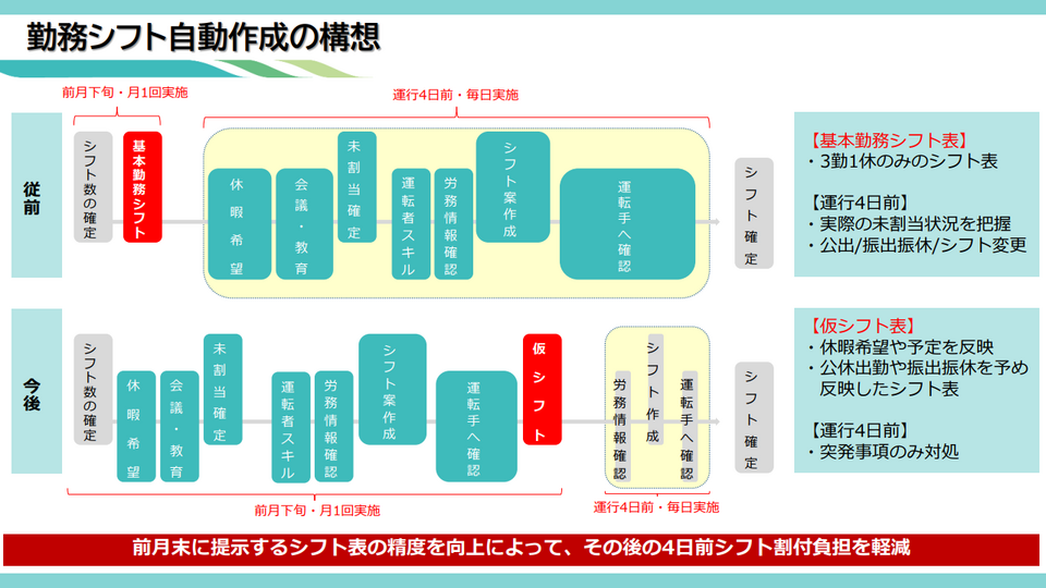 今回のシフト表自動作成機能の導入により、バス業界の複雑な法定規則や勤務実態を遵守しつつ、各運転手の仕事量の平準化を達成しました。