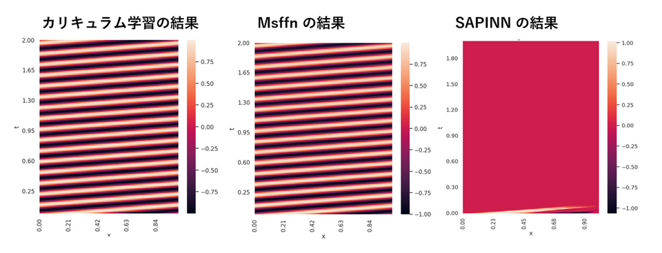 上記の手法のうちいくつかを、移流方程式の PINN に適用し failure mode を回避できるか検証した結果を以下に示します。成功例として、カリキュラム学習と MSFFN の学習結果を示すと Fig.4 (左、中) のようになり、いずれも failure mode を回避できています。なお、カリキュラム学習では移流速度 $\beta$ を徐々に大きくするカリキュラムを用いています。一方、上記の工夫の全てが移流方程式の faluire mode 回避に有効という訳ではなく、例えば、標本点の適応的重み付けのアルゴリズムである SAPINN を用いた場合はやはり failure mode が生じています (Fig.4 右)。よって、個別の問題ごとにいずれの工夫が有効かを試行錯誤する事が重要になります。