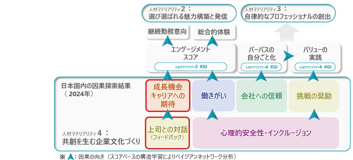 甲田 エンゲージメント調査をベイジアンネットワーク分析した因果探索結果を図に示します。例えば「共創を生む企業文化づくり」の施策として「上司との対話」を実施したところ、「成長機会・キャリアへの期待」につながってエンゲージメントスコアを高め、継続勤務意向や総合的体験に結びつくことが明らかになりました。また「会社への信頼」があれば、「パーパスの自分ごと化」や「バリューの実践」へとつながっていくことも分かりました。解析結果を事業所や職種単位でグルーピングすると、それぞれの立場での従業員の動向が見えます。さらに全社を俯瞰するところまで広げると、エンゲージメントの動向を示す構造が浮かび上がります。当社はグループ全体で従業員が約24,600人、調査の回答率が88%なので約21,700人分の解析です。この結果を、切り口を変えるなどして確認すると、エンゲージメントスコアやパーパス・バリューの浸透に効く因子やその因果関係が分かります。他への影響が大きい要素やスコアが低い要素は要改善ポイントなので、改善につながる施策を新たに考えます。このように構造全体をつかめることで、相関分析のときよりも具体的な議論が、データを基にできるようになっています。