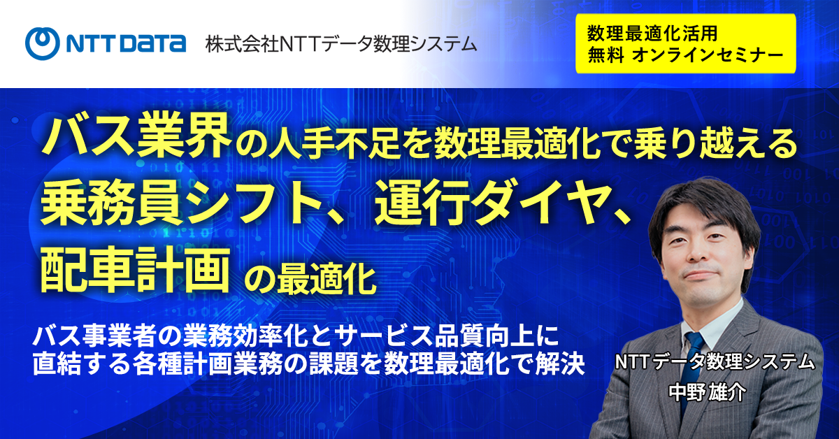 乗務員のシフト編成、運行ダイヤの設計、配車計画の立案など、バス事業者様の各種業務において、数理最適化がどのように貢献できるかを、具体的な導入事例を交えて解説いたします。