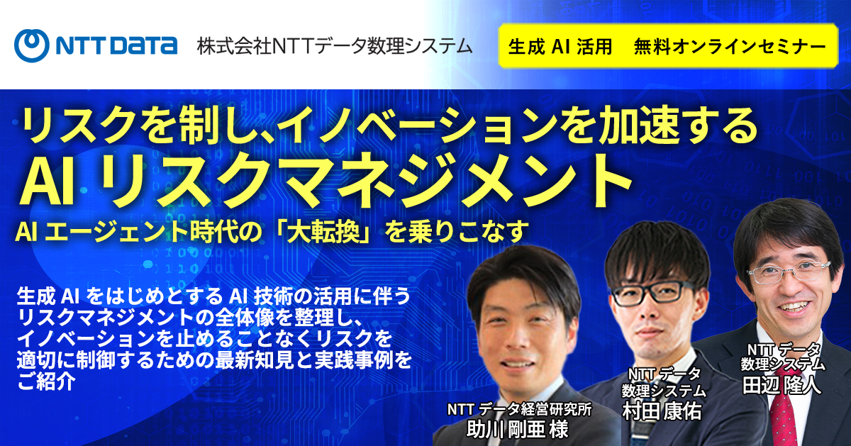 生成AIをはじめとするAI技術の活用に伴うリスクマネジメントの全体像を整理し、イノベーションを止めることなくリスクを適切に制御するための最新知見と実践事例をご紹介します。