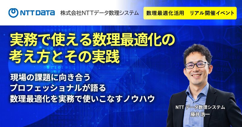 このたび、NTTデータ数理システムの社員執筆による書籍『実務で使える数理最適化の考え方 ― 基礎から学ぶモデリング』(オーム社)が出版されました。本イベントでは、その出版を記念し、著者自らが数理最適化を使いこなすノウハウや、書籍の内容に加えより深い数理最適化活用プロジェクトのリアルを解説します。