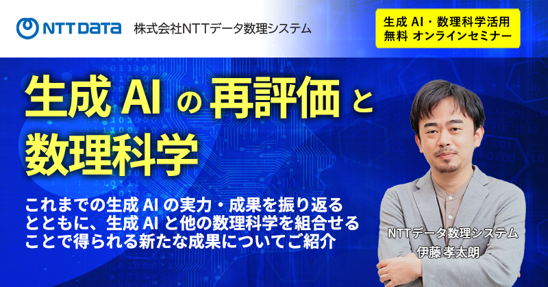 本セミナーでは、この二極化の現状を整理するとともに、「生成AIの導入における重要なポイント」「生成AIと数理科学の組み合わせによって得られる価値」という観点から、成功する5社に入るためのヒントをお伝えします。