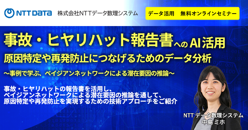 本セミナーでは、事故・ヒヤリハットの報告書を活用し、ベイジアンネットワークによる潜在要因の推論を通して、原因特定や再発防止を実現するための技術アプローチをご紹介します。